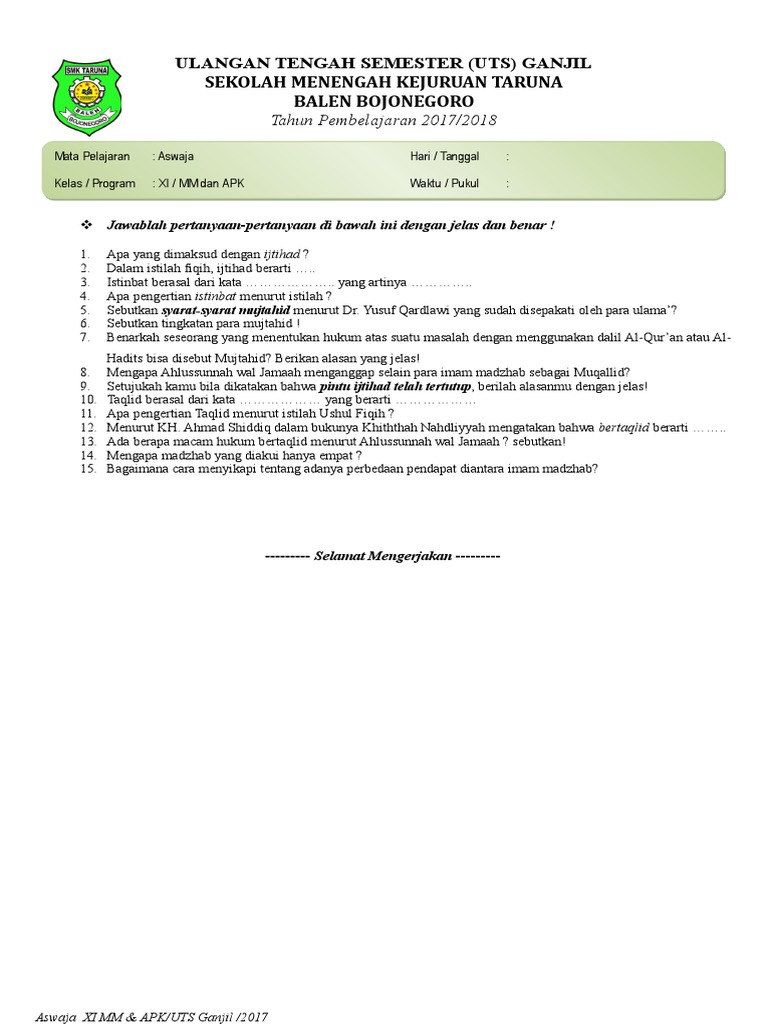 Ulangan Tengah Semester Uts Ganjil Sekolah Menengah Kejuruan Taruna Balen Bojonegoro
